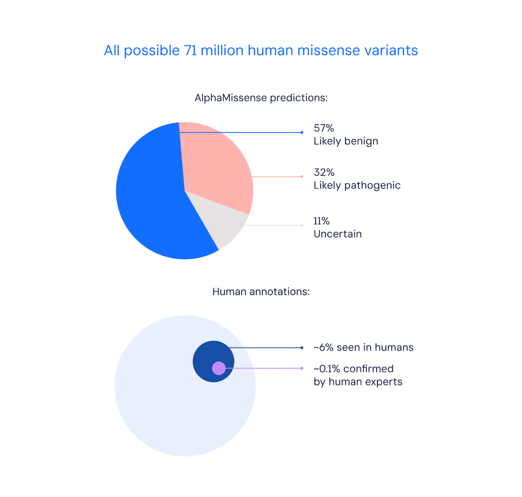 AlphaMissense predicted the pathogenicity of all possible 71 million missense variants. It classified 89% – predicting 57% were likely benign and 32% were likely pathogenic.