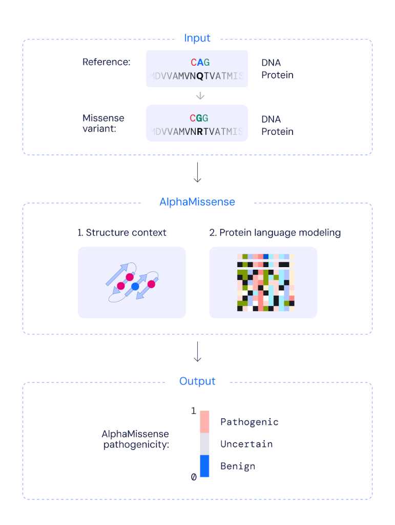 AlphaMissense est basé sur notre modèle révolutionnaire AlphaFold, qui prédit les structures de presque toutes les protéines connues de la science à partir de leurs séquences d’acides aminés. Notre modèle adapté peut prédire la pathogénicité des variantes faux-sens altérant les acides aminés individuels des protéines.