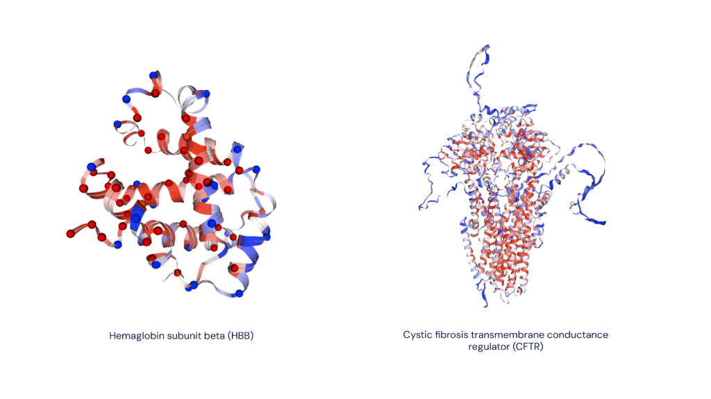 Une étape clé dans la traduction de ces recherches consiste à collaborer avec la communauté scientifique. Nous travaillons en partenariat avec Genomics England pour explorer comment ces prédictions pourraient aider à étudier la génétique des maladies rares. Genomics England a croisé les résultats d’AlphaMissense avec des données sur la pathogénicité des variantes précédemment regroupées avec des participants humains. Leur évaluation a confirmé que nos prédictions sont exactes et cohérentes, fournissant ainsi une autre référence concrète pour AlphaMissense.